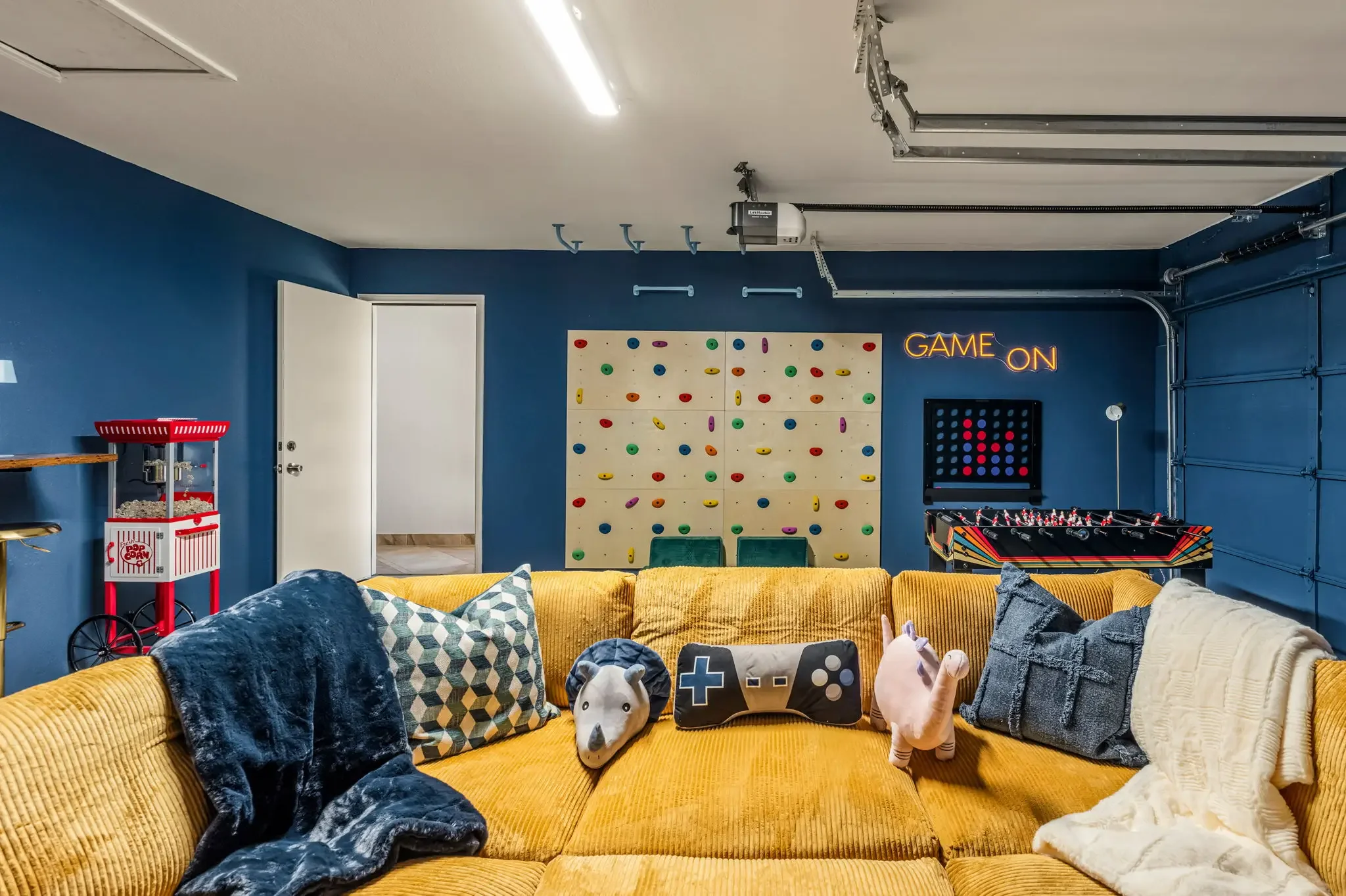 Reviews from guests:We loved our stay here!! We visited with two little ones and this house was exactly what we needed. There was plenty of space for them to run and play outside with wonderful things to do inside as well. The rock wall and game area in the garage were really amazing and can be used for all ages. We had a fun movie night on the giant couch with popcorn and snacks.