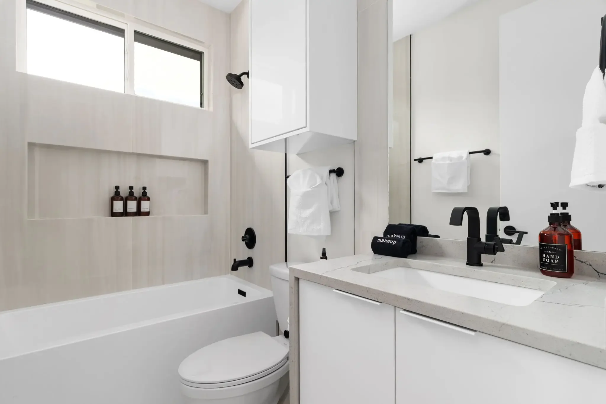 Things like trays, soap dispensers, towel holders, and art do not need a big budget. If it fits the budget, it can be fun to add painted walls or wallpaper for some character, but it is not necessary. Most guests actually prefer bathrooms that feel clean and simple, often with white or neutral walls that feel cleaner.
